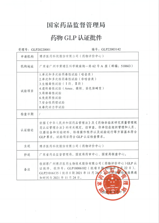 | 药物GLP认证批件 | AAALAC证书 |